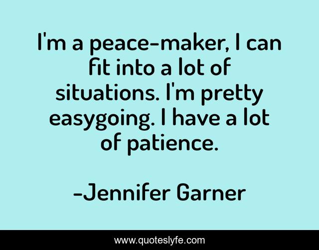 This page presents the quote "I'm a peace-maker, I can fit into a lot of situations. I'm pretty easygoing. I have a lot of patience.". Author of this quote is Jennifer Garner. This quote is about i can, pretty, fit,.