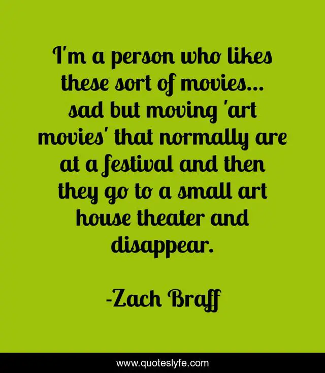 This page presents the quote "I'm a person who likes these sort of movies... sad but moving 'art movies' that normally are at a festival and then they go to a small art house theater and disappear.". Author of this quote is Zach Braff. This quote is about small, art, moving,.