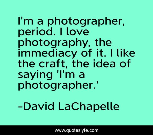 This page presents the quote "I'm a photographer, period. I love photography, the immediacy of it. I like the craft, the idea of saying 'I'm a photographer.'". Author of this quote is David LaChapelle. This quote is about saying, photography, idea,.