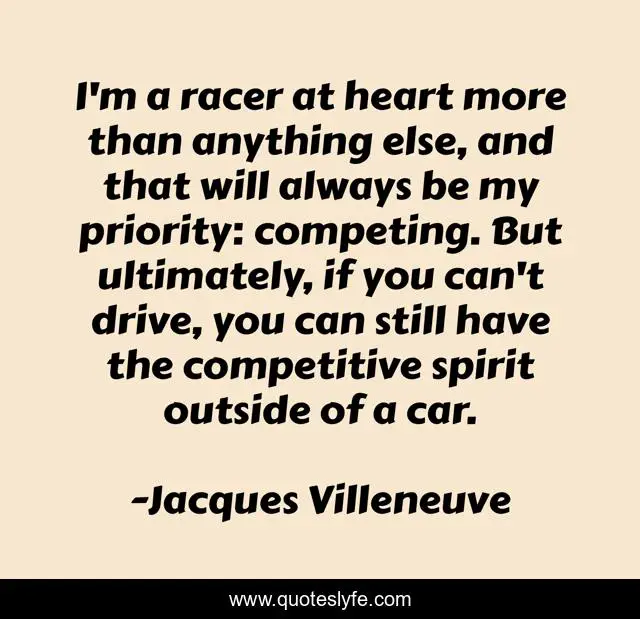 This page presents the quote "I'm a racer at heart more than anything else, and that will always be my priority: competing. But ultimately, if you can't drive, you can still have the competitive spirit outside of a car.". Author of this quote is Jacques Villeneuve. This quote is about heart, drive,.