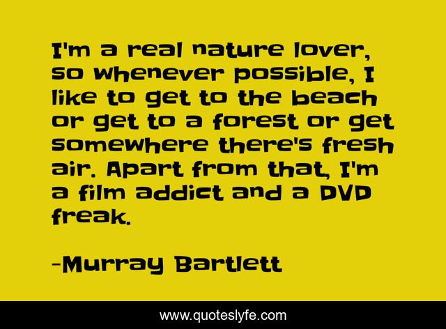 This page presents the quote "I'm a real nature lover, so whenever possible, I like to get to the beach or get to a forest or get somewhere there's fresh air. Apart from that, I'm a film addict and a DVD freak.". Author of this quote is Murray Bartlett. This quote is about real, beach, forest,.