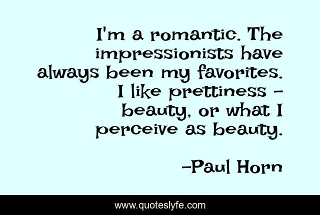 This page presents the quote "I'm a romantic. The impressionists have always been my favorites. I like prettiness - beauty, or what I perceive as beauty.". Author of this quote is Paul Horn. This quote is about always, like, beauty,.