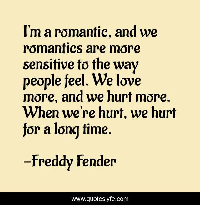 This page presents the quote "I'm a romantic, and we romantics are more sensitive to the way people feel. We love more, and we hurt more. When we're hurt, we hurt for a long time.". Author of this quote is Freddy Fender. This quote is about time, love, affection, hurt,.