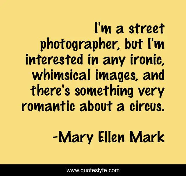 This page presents the quote "I'm a street photographer, but I'm interested in any ironic, whimsical images, and there's something very romantic about a circus.". Author of this quote is Mary Ellen Mark. This quote is about photographer, circus, street,.