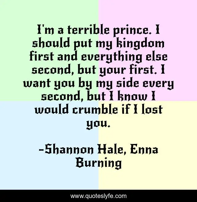 This page presents the quote "I'm a terrible prince. I should put my kingdom first and everything else second, but your first. I want you by my side every second, but I know I would crumble if I lost you.". Author of this quote is Shannon Hale, Enna Burning. .