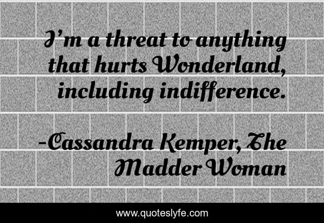 This page presents the quote "I’m a threat to anything that hurts Wonderland, including indifference.". Author of this quote is Cassandra Kemper, The Madder Woman. This quote is about noble, crazy, hero, alice, insanity, threat, wonderland, madness, indifference,.