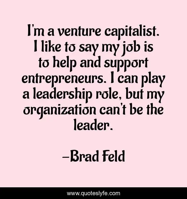 This page presents the quote "I'm a venture capitalist. I like to say my job is to help and support entrepreneurs. I can play a leadership role, but my organization can't be the leader.". Author of this quote is Brad Feld. This quote is about job, support, leader,.