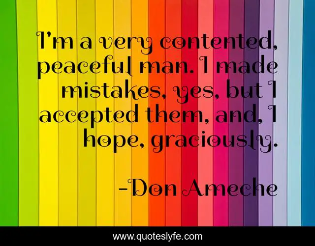 This page presents the quote "I'm a very contented, peaceful man. I made mistakes, yes, but I accepted them, and, I hope, graciously.". Author of this quote is Don Ameche. This quote is about mistakes, man, peaceful,.