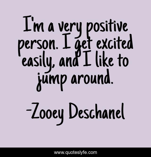 This page presents the quote "I'm a very positive person. I get excited easily, and I like to jump around.". Author of this quote is Zooey Deschanel. This quote is about jump, person, like,.
