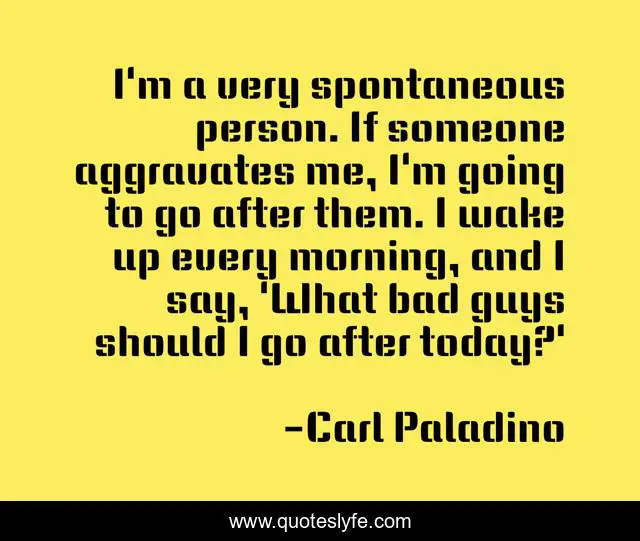 This page presents the quote "I'm a very spontaneous person. If someone aggravates me, I'm going to go after them. I wake up every morning, and I say, 'What bad guys should I go after today?'". Author of this quote is Carl Paladino. This quote is about wake up, me, today,.