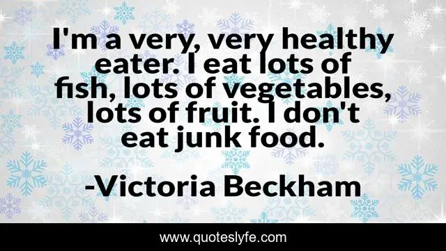 This page presents the quote "I'm a very, very healthy eater. I eat lots of fish, lots of vegetables, lots of fruit. I don't eat junk food.". Author of this quote is Victoria Beckham. This quote is about healthy, fish, fruit,.