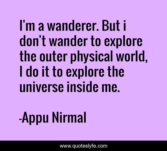 This page presents the quote "I'm a wanderer. But i don't wander to explore the outer physical world, I do it to explore the universe inside me.". Author of this quote is Appu Nirmal. This quote is about exploring, explorer, wanderer, universe, purpose-of-wandering, wandering,.