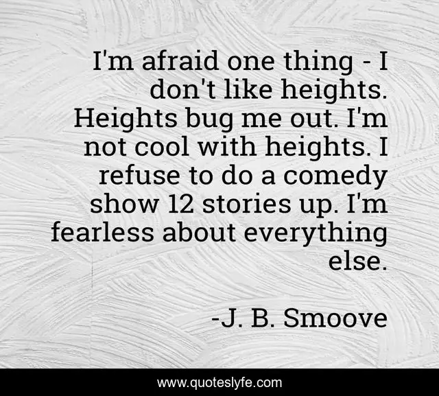 This page presents the quote "I'm afraid one thing - I don't like heights. Heights bug me out. I'm not cool with heights. I refuse to do a comedy show 12 stories up. I'm fearless about everything else.". Author of this quote is J. B. Smoove. This quote is about me, fearless, comedy,.