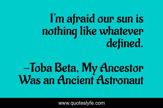 This page presents the quote "I'm afraid our sun is nothing like whatever defined.". Author of this quote is Toba Beta, My Ancestor Was an Ancient Astronaut. This quote is about mystery, sun,.