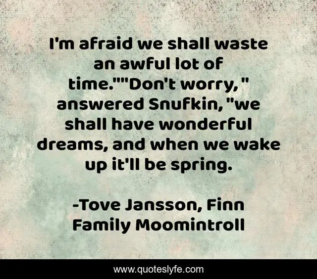 This page presents the quote "I'm afraid we shall waste an awful lot of time.""Don't worry, " answered Snufkin, "we shall have wonderful dreams, and when we wake up it'll be spring.". Author of this quote is Tove Jansson, Finn Family Moomintroll. This quote is about hibernation, sleep, time,.