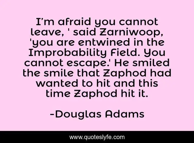 I’m afraid you cannot leave, ' said Zarniwoop, 'you are entwined in the Improbability Field. You cannot escape.' He smiled the smile that Zaphod had wanted to hit and this time Zaphod hit it.