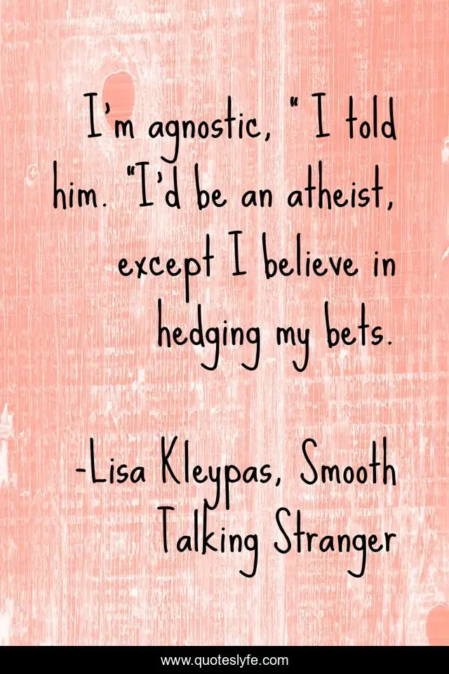 This page presents the quote "I'm agnostic, " I told him. "I'd be an atheist, except I believe in hedging my bets.". Author of this quote is Lisa Kleypas, Smooth Talking Stranger. This quote is about atheist, agnostic,.