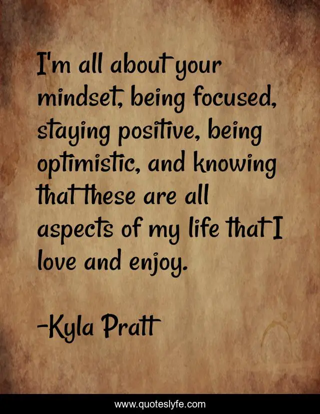 This page presents the quote "I'm all about your mindset, being focused, staying positive, being optimistic, and knowing that these are all aspects of my life that I love and enjoy.". Author of this quote is Kyla Pratt. This quote is about enjoy, life, love, affection,.