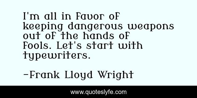 This page presents the quote "I'm all in favor of keeping dangerous weapons out of the hands of fools. Let's start with typewriters.". Author of this quote is Frank Lloyd Wright. This quote is about second-amendment, writers,.