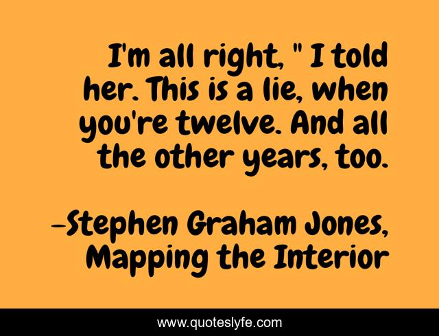 This page presents the quote "I'm all right, " I told her. This is a lie, when you're twelve. And all the other years, too.". Author of this quote is Stephen Graham Jones, Mapping the Interior. .