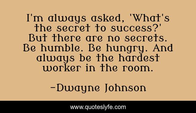 This page presents the quote "I'm always asked, 'What's the secret to success?' But there are no secrets. Be humble. Be hungry. And always be the hardest worker in the room.". Author of this quote is Dwayne Johnson. This quote is about secrets, be humble, humble,.