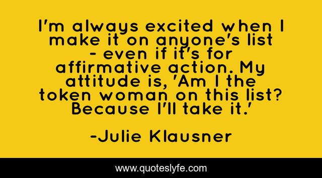 This page presents the quote "I'm always excited when I make it on anyone's list - even if it's for affirmative action. My attitude is, 'Am I the token woman on this list? Because I'll take it.'". Author of this quote is Julie Klausner. This quote is about action, always, woman,.