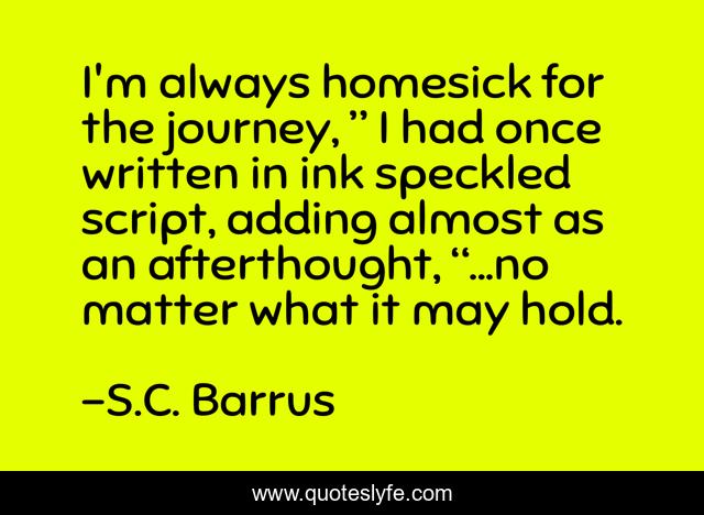 "S.C. Barrus Quotes." Quoteslyfe.com, 2025. Mon. 08 Dec. 2025. <https://www.quoteslyfe.com/quote/I-m-always-homesick-for-the-journey-151883>.