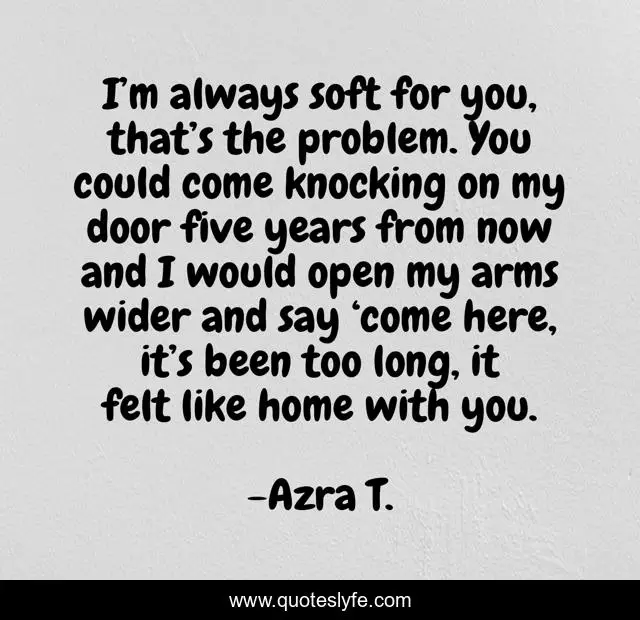 This page presents the quote "I’m always soft for you, that’s the problem. You could come knocking on my door five years from now and I would open my arms wider and say ‘come here, it’s been too long, it felt like home with you.". Author of this quote is Azra T.. This quote is about longing, love, affection,.