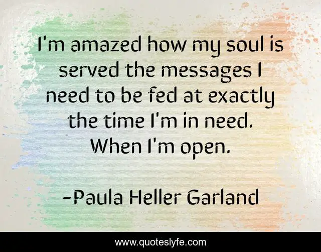 This page presents the quote "I'm amazed how my soul is served the messages I need to be fed at exactly the time I'm in need. When I'm open.". Author of this quote is Paula Heller Garland. This quote is about need, soul,.