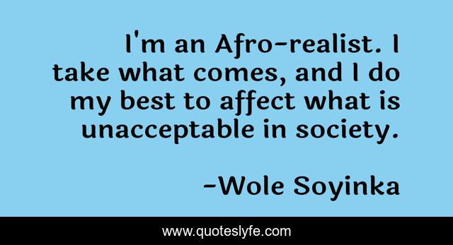 This page presents the quote "I'm an Afro-realist. I take what comes, and I do my best to affect what is unacceptable in society.". Author of this quote is Wole Soyinka. This quote is about affect, take, best,.