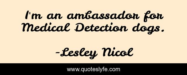 This page presents the quote "I'm an ambassador for Medical Detection dogs.". Author of this quote is Lesley Nicol. This quote is about detection, ambassador, dogs,.