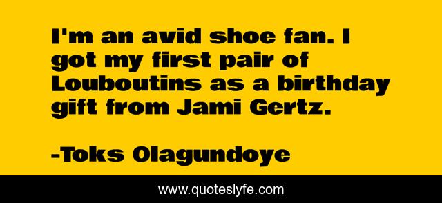 This page presents the quote "I'm an avid shoe fan. I got my first pair of Louboutins as a birthday gift from Jami Gertz.". Author of this quote is Toks Olagundoye. This quote is about shoe, gift, first,.