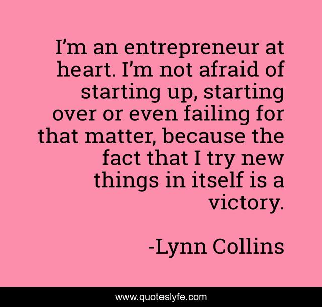This page presents the quote "I’m an entrepreneur at heart. I’m not afraid of starting up, starting over or even failing for that matter, because the fact that I try new things in itself is a victory.". Author of this quote is Lynn Collins. This quote is about entrepreneur, entrepreneurial,.