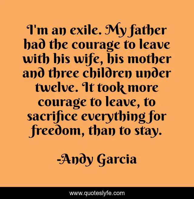 This page presents the quote "I'm an exile. My father had the courage to leave with his wife, his mother and three children under twelve. It took more courage to leave, to sacrifice everything for freedom, than to stay.". Author of this quote is Andy Garcia. This quote is about freedom, father, children,.