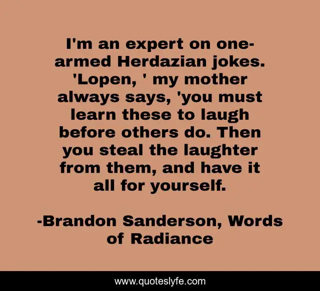 This page presents the quote "I'm an expert on one-armed Herdazian jokes. 'Lopen, ' my mother always says, 'you must learn these to laugh before others do. Then you steal the laughter from them, and have it all for yourself.". Author of this quote is Brandon Sanderson, Words of Radiance. This quote is about inspirational-attitude, lopen, laughter, inspirational, enthusiasm,.