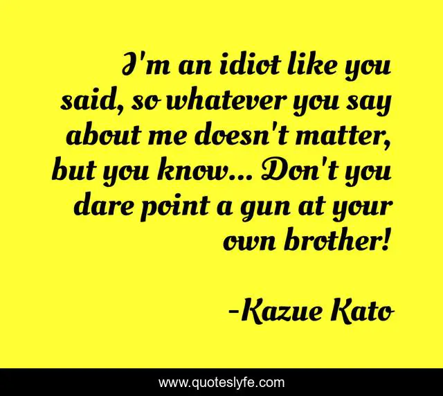 This page presents the quote "I'm an idiot like you said, so whatever you say about me doesn't matter, but you know... Don't you dare point a gun at your own brother!". Author of this quote is Kazue Kato. This quote is about enthusiasm, family, trust, daring, inspirational,.
