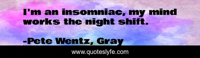 This page presents the quote "I'm an insomniac, my mind works the night shift.". Author of this quote is Pete Wentz, Gray. This quote is about insomnia, sleepless, mind, non-stop, brain, sleep,.