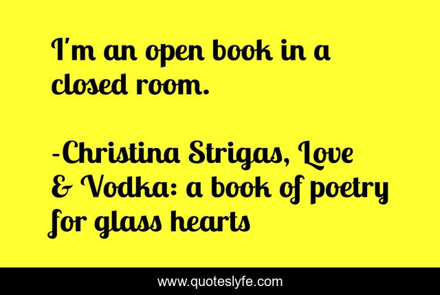 This page presents the quote "I'm an open book in a closed room.". Author of this quote is Christina Strigas, Love & Vodka: a book of poetry for glass hearts. This quote is about love, love-and-sayings, poetry, poetry-life, affection, love-poetry,.