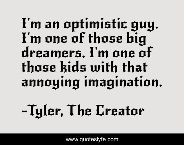 This page presents the quote "I'm an optimistic guy. I'm one of those big dreamers. I'm one of those kids with that annoying imagination.". Author of this quote is Tyler, The Creator. This quote is about dreamers, annoying, kids,.