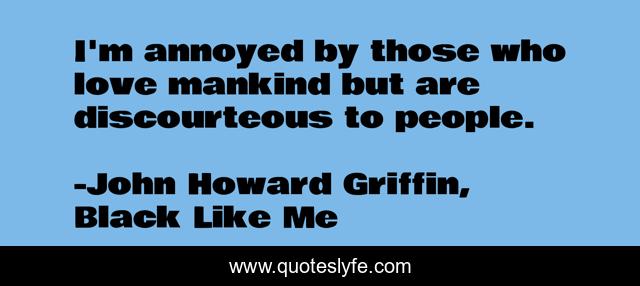 This page presents the quote "I'm annoyed by those who love mankind but are discourteous to people.". Author of this quote is John Howard Griffin, Black Like Me. This quote is about idealism, graciousness, hypocrisy,.