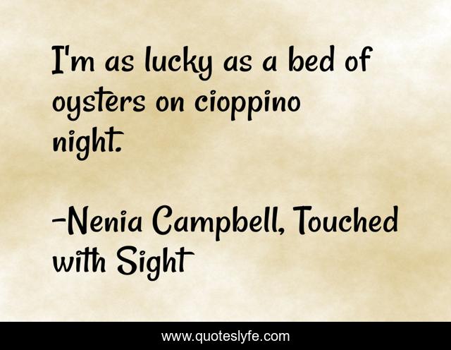 This page presents the quote "I'm as lucky as a bed of oysters on cioppino night.". Author of this quote is Nenia Campbell, Touched with Sight. This quote is about dark, misfortune, humor, sarcasm, irony, lucky, lucky-people, bad-luck, fortune,.