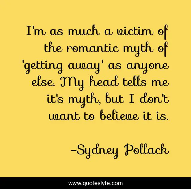 This page presents the quote "I'm as much a victim of the romantic myth of 'getting away' as anyone else. My head tells me it's myth, but I don't want to believe it is.". Author of this quote is Sydney Pollack. This quote is about me, believe,.