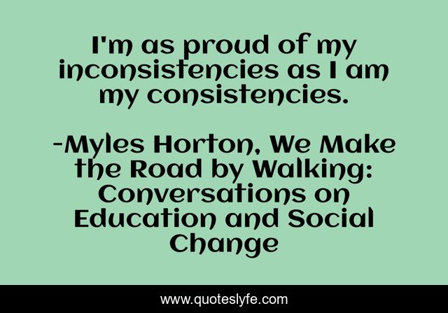 This page presents the quote "I'm as proud of my inconsistencies as I am my consistencies.". Author of this quote is Myles Horton, We Make the Road by Walking: Conversations on Education and Social Change. This quote is about self, ideology, growth, learning, inconsistencies, education,.