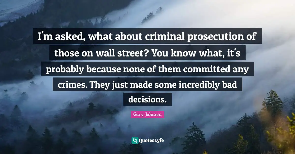 This page presents the quote "I'm asked, what about criminal prosecution of those on wall street? You know what, it's probably because none of them committed any crimes. They just made some incredibly bad decisions.". Author of this quote is Gary Johnson. This quote is about decision, prosecution, committed, criminals, made, wall,.
