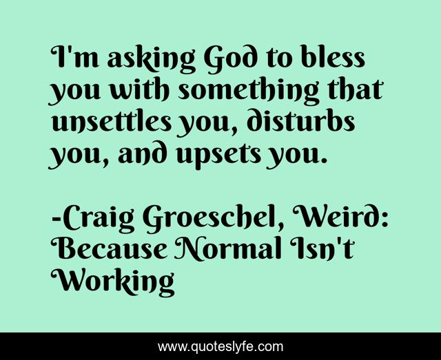 This page presents the quote "I'm asking God to bless you with something that unsettles you, disturbs you, and upsets you.". Author of this quote is Craig Groeschel, Weird: Because Normal Isn't Working. This quote is about and, god, i-m, upsets, bless, to, asking, disturbs, something,.
