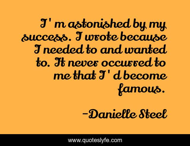 This page presents the quote "I'm astonished by my success. I wrote because I needed to and wanted to. It never occurred to me that I'd become famous.". Author of this quote is Danielle Steel. This quote is about me, success,.