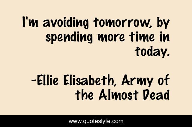 This page presents the quote "I'm avoiding tomorrow, by spending more time in today.". Author of this quote is Ellie Elisabeth, Army of the Almost Dead. This quote is about enthusiasm, thought-provoking, tomorrow, inspirational,.