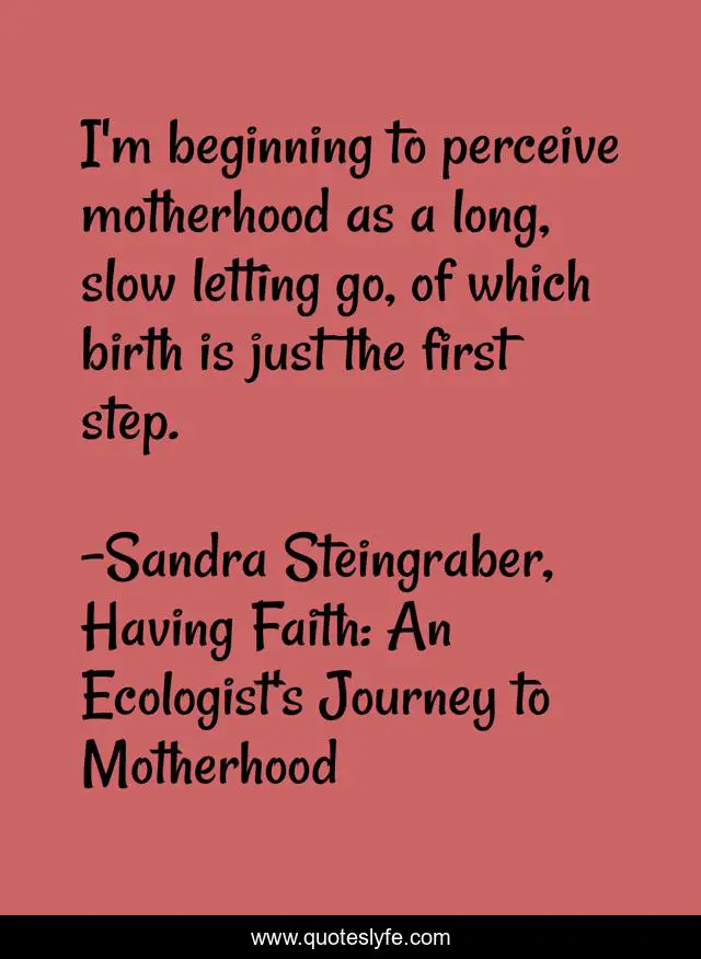 This page presents the quote "I'm beginning to perceive motherhood as a long, slow letting go, of which birth is just the first step.". Author of this quote is Sandra Steingraber, Having Faith: An Ecologist's Journey to Motherhood. This quote is about baby, motherhood, parenting,.