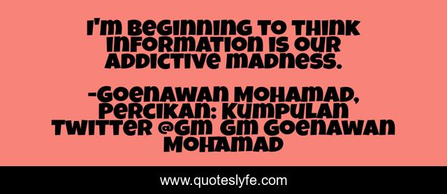 This page presents the quote "I'm beginning to think information is our addictive madness.". Author of this quote is Goenawan Mohamad, Percikan: Kumpulan Twitter @gm_gm Goenawan Mohamad. This quote is about information, madness, informasi, media,.