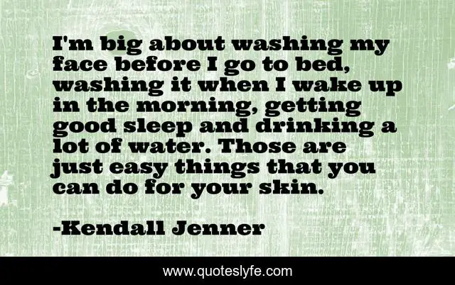 This page presents the quote "I'm big about washing my face before I go to bed, washing it when I wake up in the morning, getting good sleep and drinking a lot of water. Those are just easy things that you can do for your skin.". Author of this quote is Kendall Jenner. This quote is about water, good, sleep,.